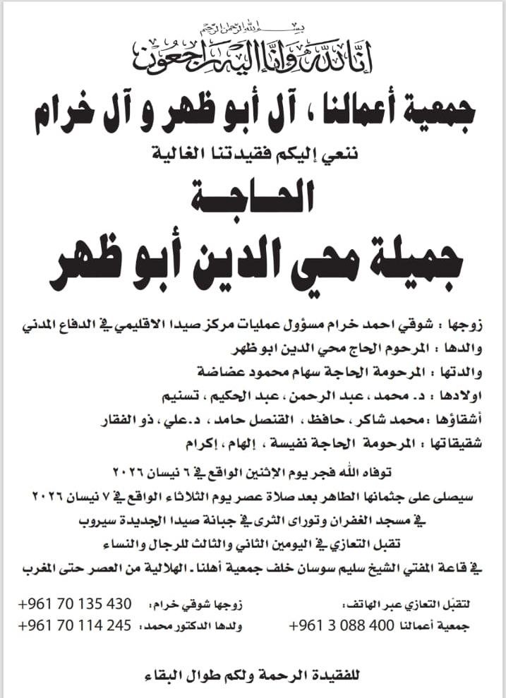 سيصلى على جثمانها الطاهر بعد صلاة عصر يوم الثلاثاء الواقع في ٧ نيسان ٢٠٢٦ في مسجد الغفران وتوارى الثرى في جبانة صيدا الجديدة سيروب